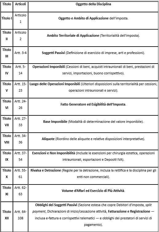 La nuova base normativa si articola in 171 articoli suddivisi in 18 titoli, e ha come obiettivo primario l’armonizzazione delle due principali fonti storiche della materia: il D.P.R. 633/1972, relativo alle operazioni nazionali, e il D.L. 331/1993, che disciplina le operazioni intraunionali.
