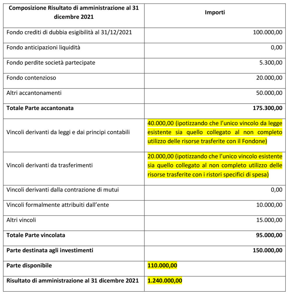 Abbiamo qui riportato uno schema “fittizio” di risultato di amministrazione che utilizzeremo per esemplificare quanto anticipato. Gli elementi da osservare sono quelli evidenziati in giallo.